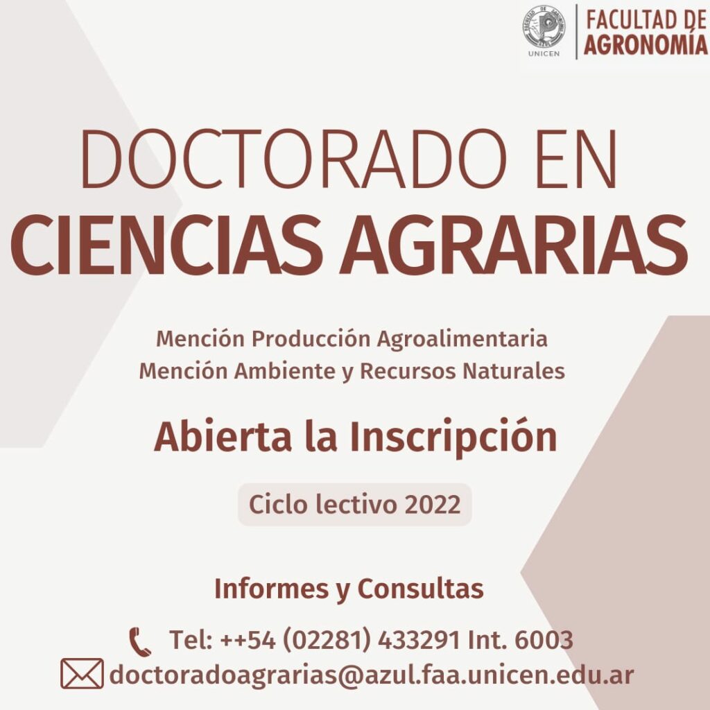 DOCTORADO EN CIENCIAS AGRARIAS Mención en Producción Agroalimentaria Mención Ambiente y Recursos Naturales Se encuentra abierta la inscripción al DOCTORADO EN CIENCIAS AGRARIAS que se dicta en la…