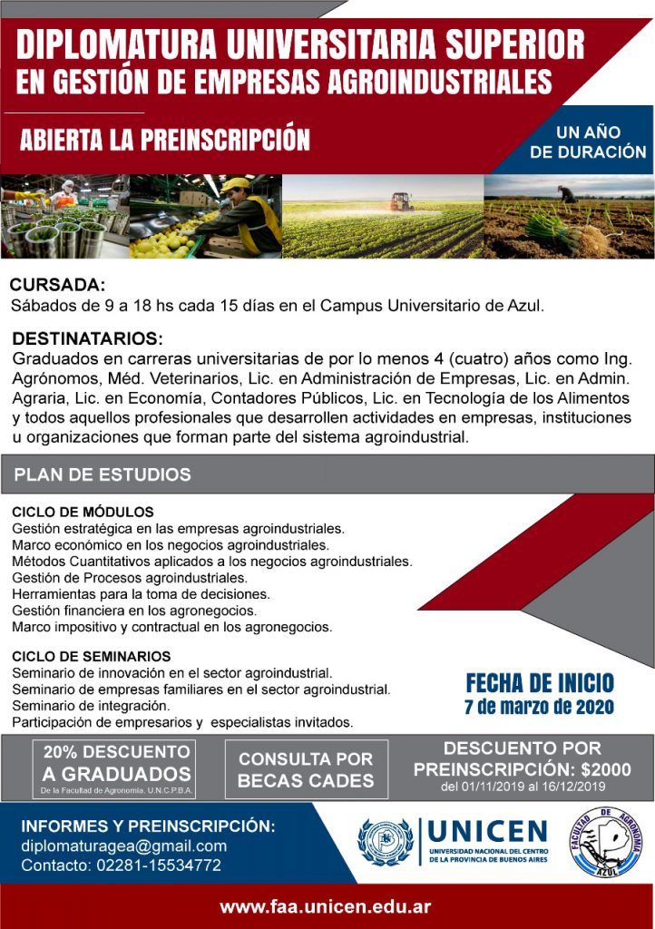 Diplomatura en Gestión de Empresas Agroindustriales Se encuentra abierta la preinscripción a la edición 2020 de la Diplomatura Universitaria Superior en Gestión de Empresas Agroindustriales. Informate escribiendo a diplomaturagea@gmail.comTel al…