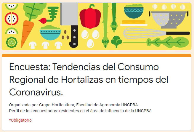 Encuesta: Tendencias del Consumo Regional de Hortalizas en tiempos del Coronavirus Compartimos con ustedes una encuesta que están llevando a cabo desde el Grupo Horticultura de la Facultad, en el marco de sus proyectos de investigación (Programa…