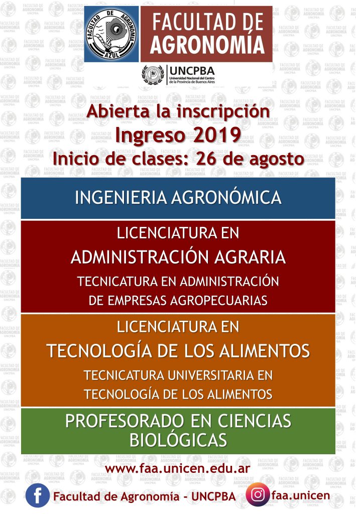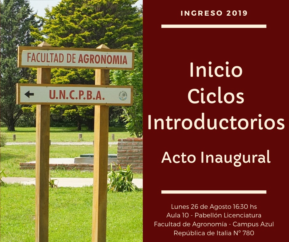 Ingreso 2019: Comienzo de cursos introductorios Acto inaugural: 26 de agosto, 16.30 hs. Lugar: Aula 10, Pabellón de Licenciatura, Facultad de Agronomía UNCPBA