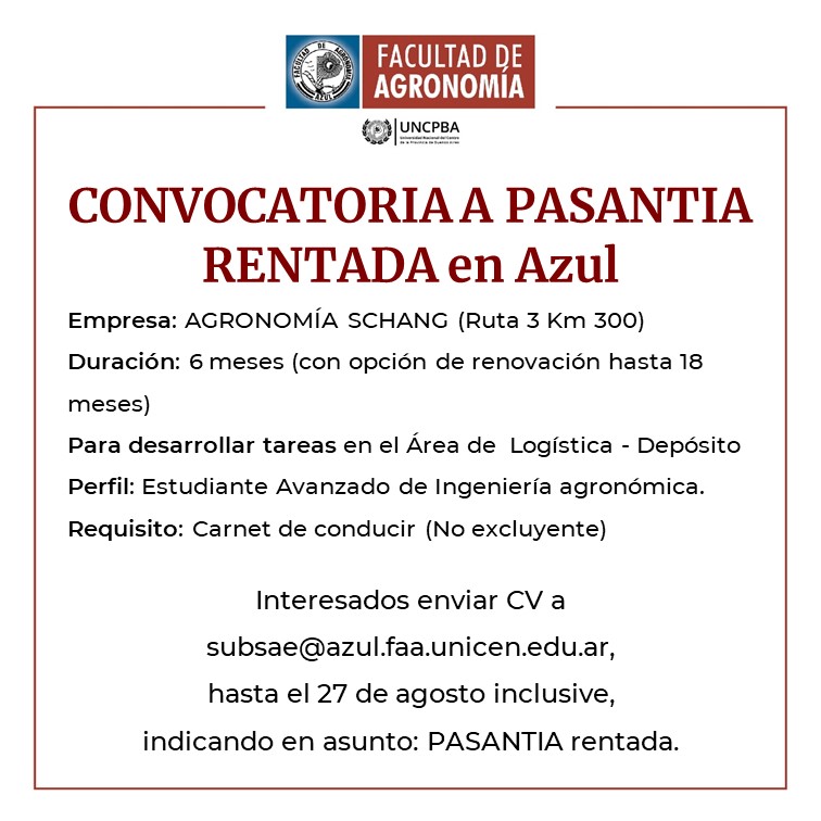 CONVOCATORIA A PASANTIA RENTADA en Azul para estudiantes de la Facultad de Agronomía UNCPBA📍Empresa: Agronomía SCHANG (Azul)⏰Duración: 6 meses (con opción de renovación hasta 18 meses)👉🏻Para desarrollar tareas en el…