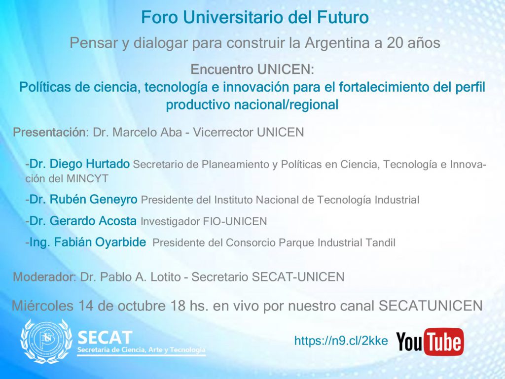 “Foro Universitario del Futuro: Pensar y dialogar para construir la Argentina a 20 años” Presentación: Dr. Marcelo Aba – Vicerector UNICEN –Dr. Diego Hurtado: Secretario de Planeamiento y Políticas en Ciencia, Tecnología e Innovación del MINCYT-Dr. Rubén Geneyro: Presidente del Instituto…