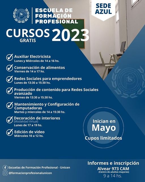 Escuela de Formación Profesional UNICEN Sede Azul – Cursos 2023 A partir de Mayo. Cupos limitados. Informes e inscripción: Centro de Adultos Mayores (Alvear 973) o al 2281 660285 (WhatsApp). Formulario de inscripción:…