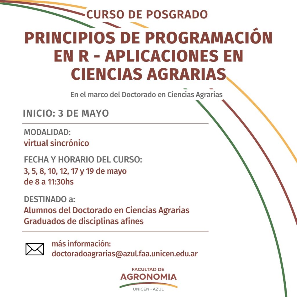 Nuevo Curso de Posgrado Principios de programación en R – Aplicaciones en Ciencias AgrariasEl día miércoles 3 de mayo iniciará un nuevo Curso de Posgrado, en el marco…