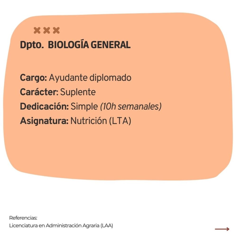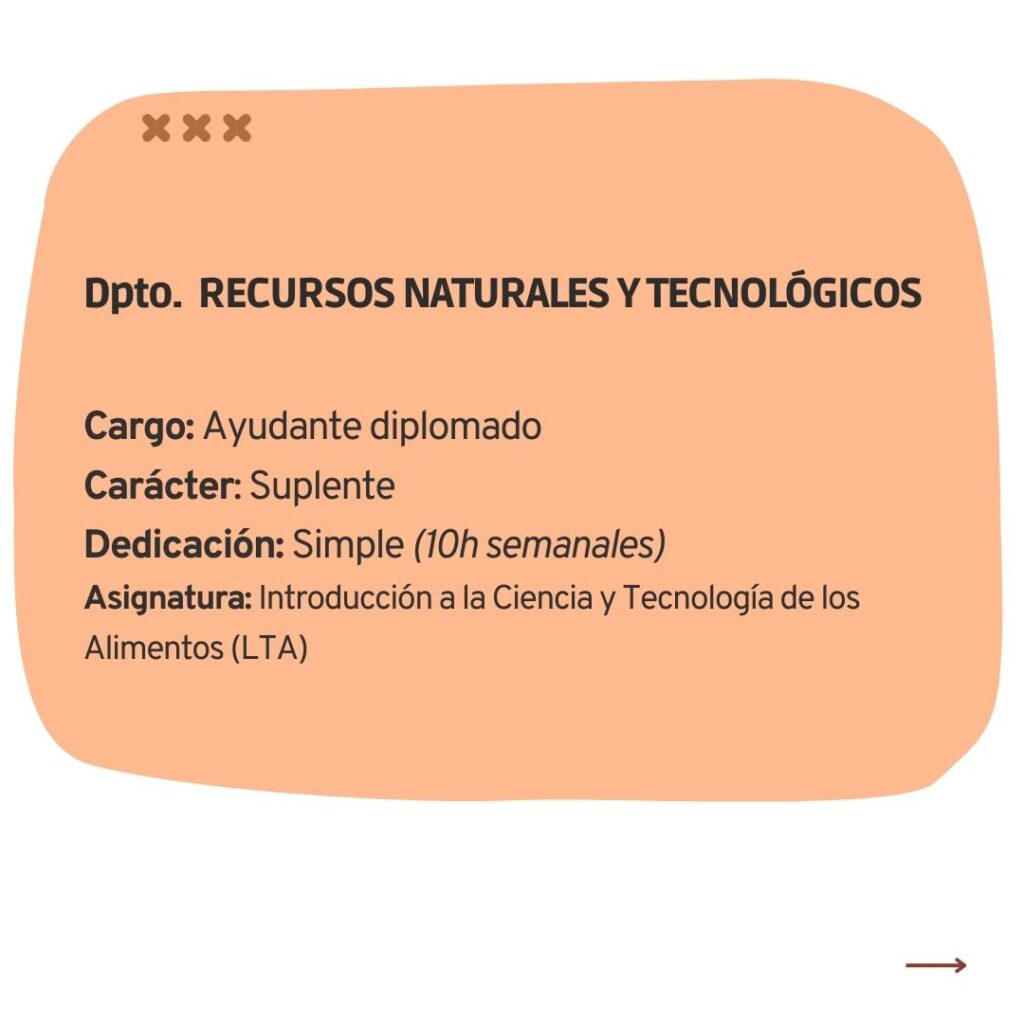 – Ayudante Diplomado con dedicación simple, -suplente-, con propuesta docente en Introducción a la Ciencia y Tecnología de los Alimentos (Carrera: Licenciatura en Tecnología de los Alimentos).