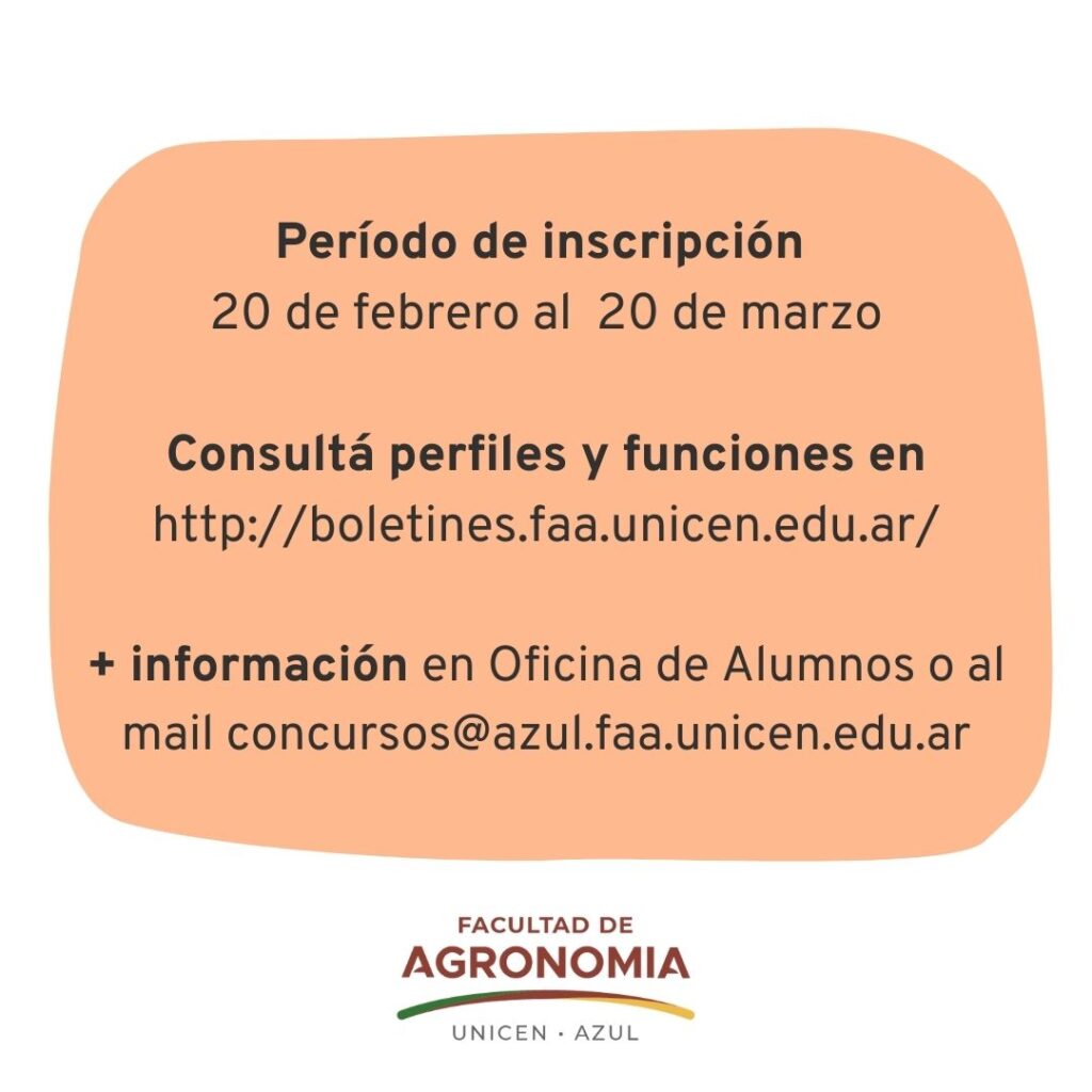 La Facultad de Agronomía UNICEN llama a inscripción para Selección por Antecedentes, según lo dispuesto por las Resoluciones de Consejo Académico Nº 287/25 y 288/25, del 20 de febrero al 20 de marzo de 2026 a las 14.00h para cubrir los cargos que a continuación se detallan: